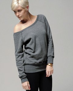 50% polyester, 37.5% cotton, 12.5% rayon; tri-blend sponge fleece; off-the-shoulder and wide neck; wide rib cuffs and waistband; laundered; Solid White and Solid Black are 50% cotton, 50% polyester; Read more...